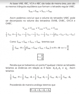 Ao ligarmos o centro O da esfera aos 4 vértices do tetraedro formaremos 4 tetraedros OVAB, OVBC, OVCA e OABC todos de alturas relativas as bases VAB, VBC, VCA e ABC iguais a r.
