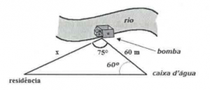 A água utilizada em uma residência é captada do rio para uma caixa d’água localizada a 60m de distância da bomba. Os ângulos formados pelas direções bomba – caixa d’água – residência é de 60° – bomba – caixa d’água é de 75°, conforme mostra a figura abaixo. Para bombear água do mesmo ponto de captação, diretamente para a residência, quantos metros de tubulação são necessários? Use \sqrt{6} = 2,4.